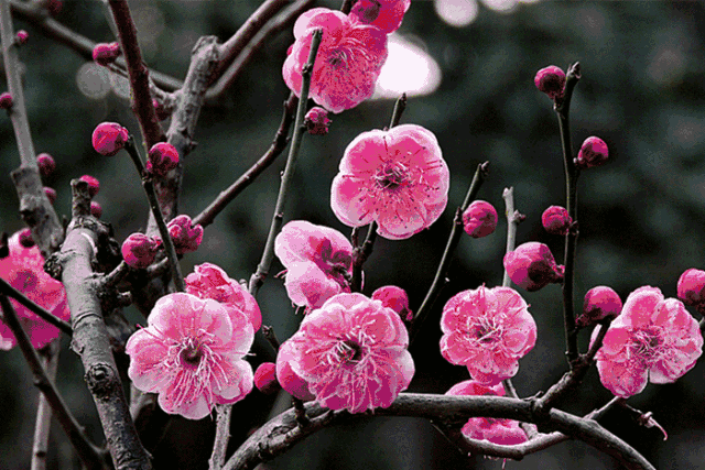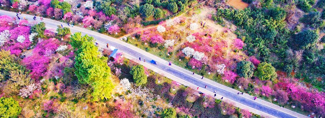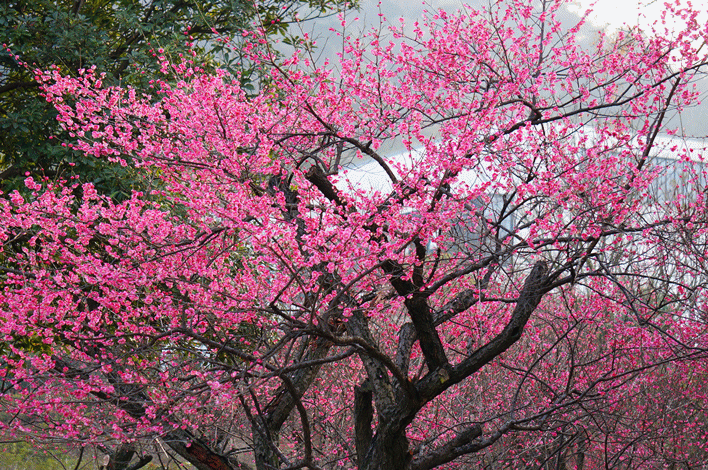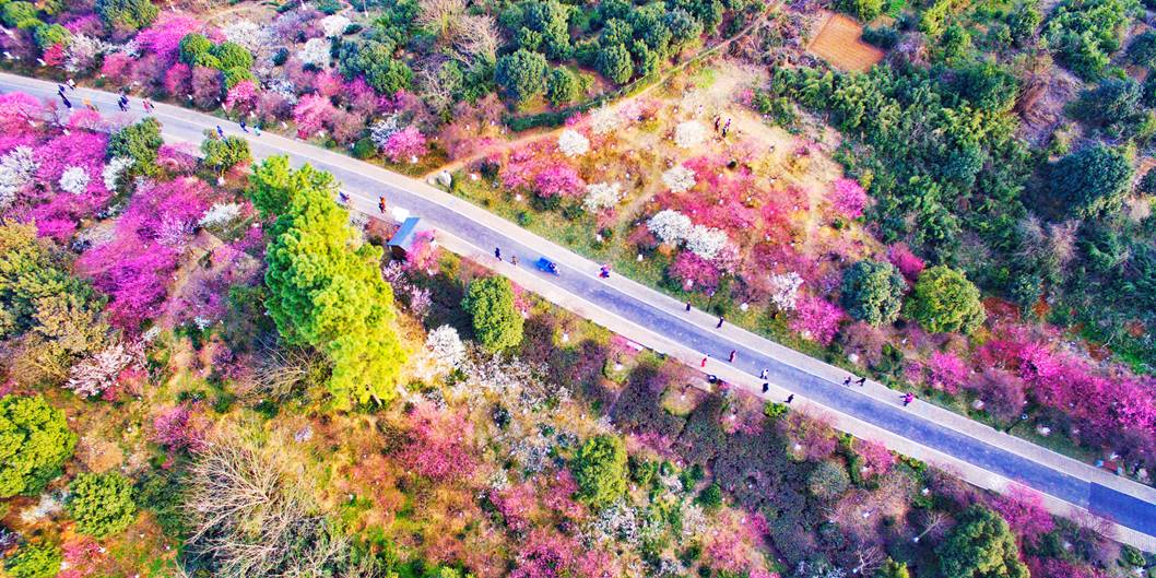 漫山的梅花竞相开放,与一旁翠绿的树林相得益彰,远远望去,好一幅漂亮的风景画。